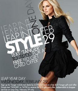 Sign-up for Tanger mobile text deals by 2/29 and receive a FREE $10 Tanger gift card offer. Simply text ‘TANGER‘ to 74700 to receive the $10 gift card offer, redeemable at Tanger Shopper Services on Leap Day, February 29 only. This deal was mentioned on their Tanger Outlets Facebook Page Here.