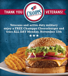 Get a FREE Cheesburger and Fries at Champps For Veterans and Military Personnel on November 12th.