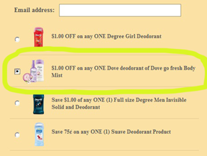 Target and Walmart stores have the travel size Dove Deodorant for $0.97, plus there is NEW $1 off ANY size Dove Deodorant printable coupons (it’s the 2nd one down, see below), making these FREE after the coupon! *NO size restrictions. See Walmarts Coupon Policy Here.