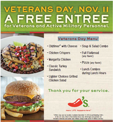 *Offers may vary by location. Available November 11, 2013 at participating Chili’s in the U.S. only. Dine in from limited menu only. Beverages and gratuity not included. Veterans and active duty military simply show proof of military service.