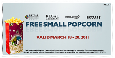 FREE Small Popcorn at Regal Cinemas 3/18 to 3/20 March 17, 2011 | 9:38 pm | Coupons For Freebies | Hunt4Freebies may earn a small commission via affiliate links in this post. Read our full disclosure policy here Reminder: Get a FREE Small Popcorn at Regal Cinemas valid March 18- March 20 [Regal Cinemas Locator] You can Also Follow Us On Facebook, Twitter, Pinterest, Instagram and Telegram for 24 hour freebie updates and more! More From Hunt4Freebies FREE Milton’s BBQ Chicken Cauliflower Crust Pizza at Sprouts5 FREE Pounds of In-Store Paper Shredding at Office DepotLane Bryant: $10 Off ANY 10+ Purchase CouponFREE SPD Fresh Dog Food Roll Sample (In-Store)FREE Febreze Fabric Refresher at Target