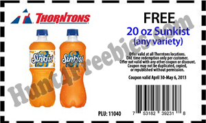 Get a FREE 20 oz Sunkist Soda at Thorntons Stores! Valid April 30th– May 6th. You will need to “Like” Thorntons on Facebook and if you do not see the coupon. Click the “COUPON” Tab at the top of their page, just above the video.