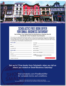 To get 2 FREE Scholastic Books fill out the Scholastic Free Book Offer for Small Business Saturday Book Redemption Card (POSTAGE IS PREPAID) with your name and address and up to two (2) small businesses that you visited on Small Business Saturday and a short reason why. See the full list of Details Here.