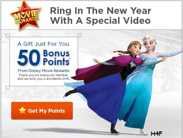 To get a 50 FREE Disney Movie Rewards Points check your emails, you should get an email sometime soon with the subject “Our New Year’s Gift To You!” The offer looks like this and contains a unique link to get the 50 free points.