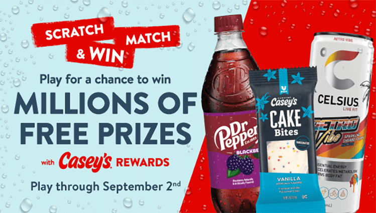 Enter daily for a chance to win the Casey’s Rewards Scratch, Match & Win Instant Win Game! Ends September 2, 2025
