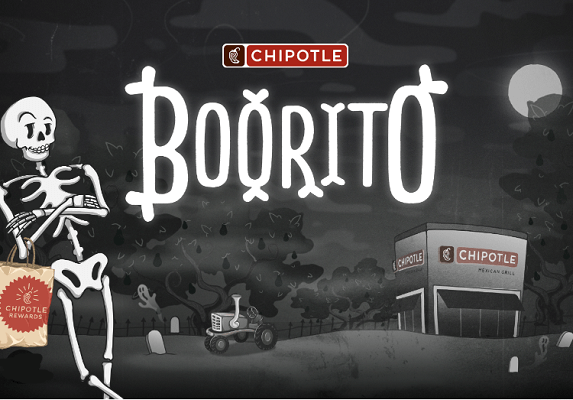 Chipotle Rewards members receive one (1) entrée item for US$6/CAN$7 when using promo code BOORITO at digital check-out via the Chipotle websites or mobile app from participating U.S./Canada locations. Valid only on October 31, 2023 beginning at 3:00 pm local time through restaurant closing; redemption is subject to availability. Not valid for kids meals, catering orders or on third party ordering platforms. Limit one free item per transaction. Extra cost for guacamole (except for veggie entreés), queso, extra meat or other modifiers. Taxes, gratuities, and any sides are not included and are the responsibility of the customer. Restrictions may apply to use with other coupons, promotions, or special offers. Additional restrictions may apply; void where prohibited.