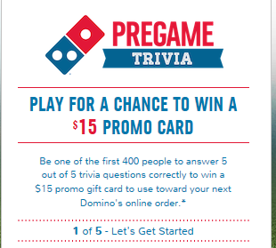 Reminder: To get a FREE $15 Domino’s Gift Card the first 400 people who answer 5/5 trivia answers correctly will get it. You can see the official rules here.