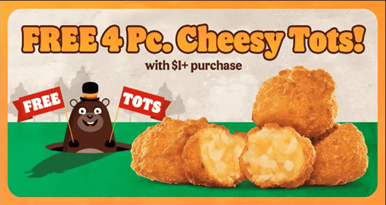 Burger King is offering FREE 4 Pc. Cheesy Tots with $1+ purchase for Groundhog Day. These snackable bites are here to make your day a little brighter—no matter the forecast. Only in the BK® App or on bk.com.