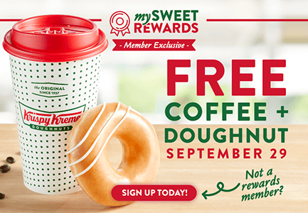 Get a FREE Doughnut & Coffee at Krispy Kreme on September 29th! Krispy Kreme will be offering all Rewards Members (free to join) a FREE coffee and original glazed doughnut! No coupon or purchase necessary! Limit 1 free brewed coffee and Original Glazed Doughnut per person.