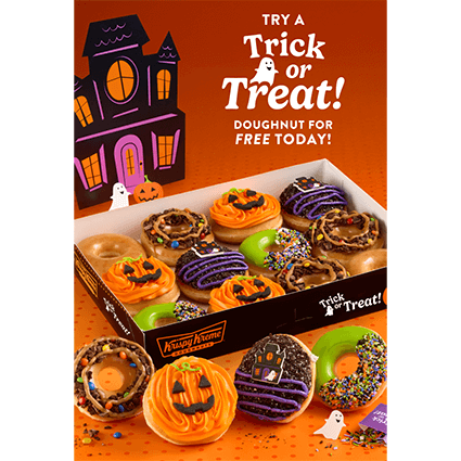 Now through Halloween Rewards Members, treat yourself this spooky season to a FREE doughnut from the Trick-or-Treat! Collection with your purchase. Qualifying items include the The Candy Bag Doughnut, Cookies & Skreme House Doughnut, Jack-O-Lantern Doughnut, or Spooky Sprinkle Doughnut. Must be a Krispy Kreme Rewards Member to redeem. In shop, scan barcode in Rewards app or provide account phone number. Online, must log into account and add reward at checkout.