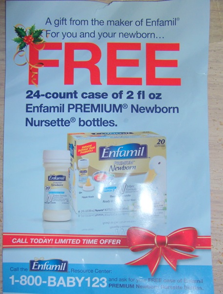 To get a FREE 24 count case of Enfamil Premium Newborn Nursette Bottles just call 1-800-BABY123 this offer is valid through 1/31/2011. Please Note: This may take a while for the call to go through they are getting swamped with calls right now.