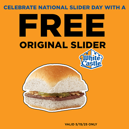 On May 15th, National Slider Day, White Castle offering a FREE Original Slider! Use the digital coupon or enter the promo code SLIDERDAY on their app. No purchase necessary.