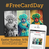 To get a FREE Photo Card for Sincerely App Users download one of the Sincerely partner apps here or on this page here to your iPhone or Android device. Today Only (March 31) you can send a free card with any of the Sincerely partner apps. Just add a picture, register or login, and you should have enough credits at checkout to send the card for free.