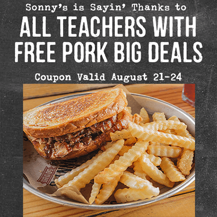 Sonny’s BBQ is offering a FREE Pork Big Deal for all teachers that includes a Pork Sandwich, Sidekick, and Soft Drink. All you have to do is verify your status. Then, they’ll send you a unique code via email that can be used from August 21-24, 2023