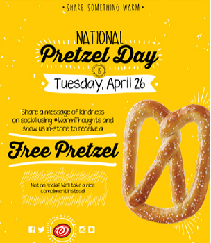 “Get your calendars out and circle Tuesday, April 26th as Pretzelmaker® celebrates its yearly tradition of giving away FREE pretzels on National Pretzel Day. Customers are invited to visit their local Pretzelmaker to receive a FREE soft pretzel (standard salted or unsalted) by sharing a message of kindness on social using #WarmThoughts and showing us in-store. Not on social? We’ll take a nice compliment instead!”