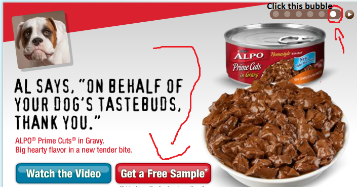 To get a FREE Purina ALPO Prime Cuts Dog Food Sample click the 6th bubble and you will get the FREE sample offer. See here for Example.