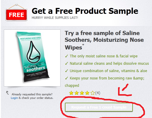 Get a FREE Saline Soothers Moisturizing Nose Wipes Sample Packs! This will go super fast!! Here is am image example of where you will need to click for the freebie.