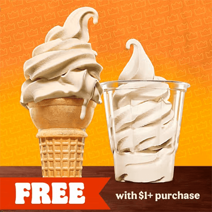 Celebrate with something sweet! Get a FREE Soft Serve Cup or Cone with $1+ purchase. Today only in the BK® App or on bk.com.