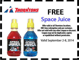 Get a FREE Space Juice Drink at Thorntons Stores! Valid September 2nd – September 8th. Weekly coupons will now only be available via the Thorntons Mobile App