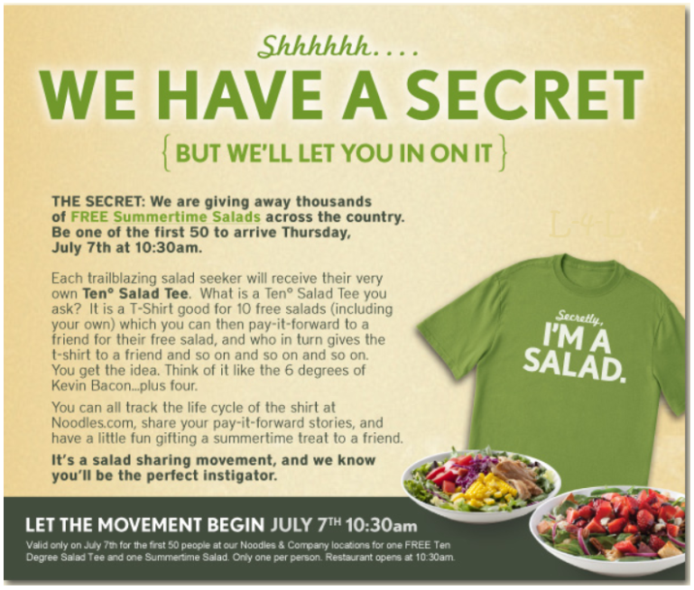 To get a FREE T-Shirt and Salad at Noodles & Company on Thursday, July 7. The first 50 people at each location will get a FREE T-Shirt and FREE Salad. The T-Shirt is also good for 9 more FREE salads.