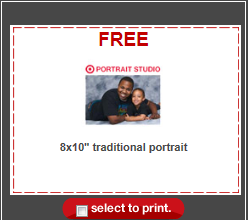Get a FREE 8×10 Portrait at Target Portrait Studio the coupon is under the “Photo” category.