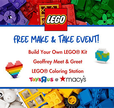 There is a FREE Toys ‘R Us LEGO Make & Take Event at Macy’s on Saturday, 4/26 from 12–2PM at select Toys“R”Us at Macy’s locations for a day of hands-on fun!