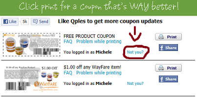 Get a FREE Wayfare Product Coupon (Facebook Offer) To get the coupon to print. Click the link that says “Not You?” within the coupon border and allow the app. See example below. (Thank you Annalisa Diaz!!)