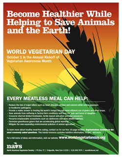 To get a FREE World Vegetarian Day Poster click the order poster button. Due to the high cost of postage, this offer applies only to those living in the United States. Anyone outside of the U.S. can download posters.