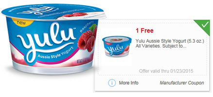 To get FREE Yulu Aussie Style Yogurt at Meijer login or register, then clip the coupon. Valid for Yulu Aussie Style Yogurt (5.3 oz.) All Varieties. Subject to Availability. Offer valid thru 01/23/2015.