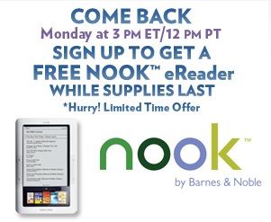 http://barnesandnoble.promotions.com/nookgiveaway/splashimg.do ~ is where we should go, but the page is lagging and doesn’t connect most of the time.