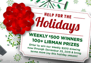 If there are sufficient entries, Libman will award to each of six winners $500 in Visa® gift cards and will award to each of 105 winners a Libman Help for the Holiday Package consisting of a variety of Libman cleaning products (ARV: $17.00 each). Total Approximate Retail Value of all gift cards and Prize Packs is $4,791.00.