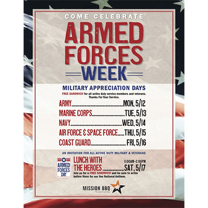 Mission BBQ Celebrates Armed Forces Week with FREE Sandwiches May 12th-17th! Starting on Monday, May 12, 2025, all active duty service members and veterans can enjoy a Free Sandwich on their designated day. These brave men and women have fought for our freedom, and they are proud to honor them. It is more than one day of honor. It’s an entire … [Read more...] about Mission BBQ Celebrates Armed Forces Week with FREE Sandwiches May 12th-17th