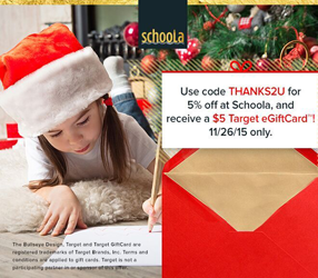 Schoola is offering a FREE $5 Target eGift Card AND 5% off ANY purchase (excluding new-with-tags) when you use promo code THANKS2U at checkout. Your Target eGift Card will be emailed to the address used at checkout after December 1st and there’s a limit of one per customer. PLUS, for a limited time, shipping is free on all orders! You can also … [Read more...] about FREE $5 Target eGift Card + Extra 5% Off (Today Only) & Free Shipping from Schoola