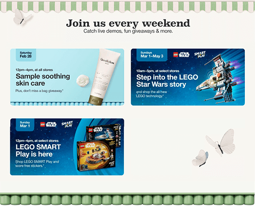 Select Targets will be hosting FREE Events & More where they will be offering free samples, giveaways, and more! Here is the line-up of upcoming events: February 28th, 2026 (12pm-4pm) – Sample soothing skin care: Plus, snag a routine bag giveaway. All Stores. March 1st – May 3rd (Sundays from 10am – 5pm). – The LEGO SMART Play … [Read more...] about FREE Events at Target (February 28th – Sample Soothing Skin Care)