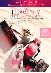 Reminder: Get a FREE Love is Heavenly Fragrance Sample at Victoria’s Secret! April 6th from 4pm-8pm and – April 7th from 2pm–6pm.